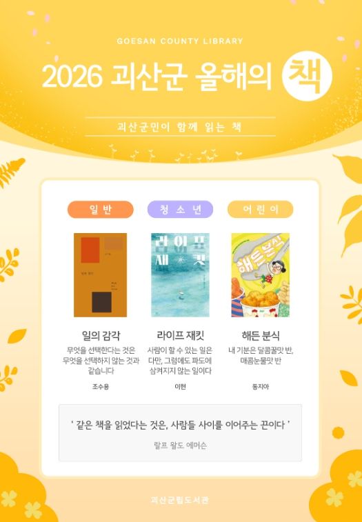 한방통신사 권영분기자 기자 | 충북 괴산군립도서관이 2026년 괴산군 올해의 책으로 일반, 청소년, 아동 분야 각 1권씩 총 3권을 최종 선정했다고 20일 밝혔다.