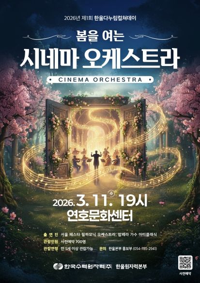 한방통신사 신유철기자 기자 | 한국수력원자력(주) 한울원자력본부는 3월 11일 19시 울진군 연호문화센터에서 제1회 한울다누림컬쳐데이 '봄을 여는 시네마 오케스트라'를 개최한다.