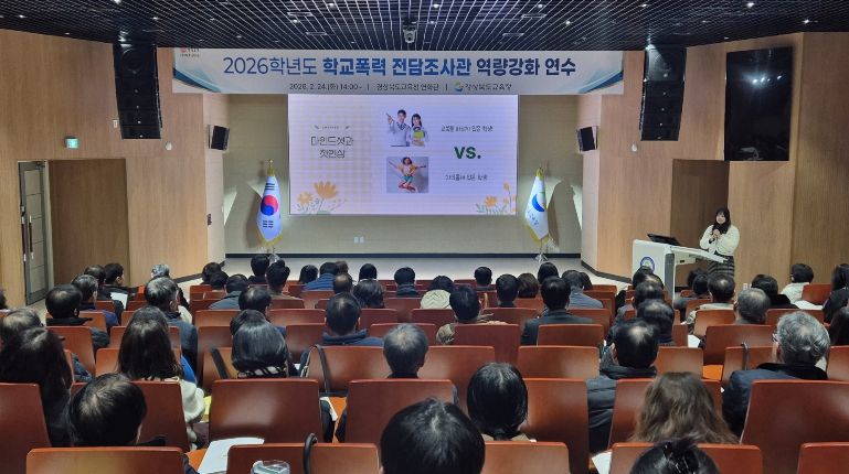 한방통신사 신유철기자 기자 | 경북교육청(교육감 임종식)은 24일 본청 행복지원동 연화관에서 도내 학교폭력 전담조사관 150명과 지역별 업무 담당자 22명 등 총 170여 명이 참석한 가운데 ‘2026학년도 제로센터 학교폭력 전담조사관 역량 강화 연수’를 개최했다고 밝혔다.