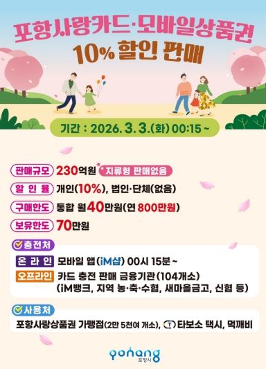 시는 이달까지 포항사랑상품권 830억 원 발행한 데 이어, 이번 할인 판매분 230억 원 추가 발행으로 올해 연초에만 총 1,060억 원 규모의 포항사랑상품권을 유통하게 된다.