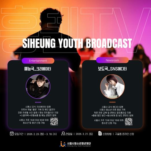 예능국은 콘텐츠 기획과 출연을 맡는 크리에이터 활동으로, 시흥시에 거주하는 16세 이상 30세 이하 청소년ㆍ청년을 대상으로 한다. 보도국은 기사 작성과 누리소통망(SNS) 에디터 역할을 맡으며, 관내에 거주하는 13세 이상 18세 이하 청소년이 지원할 수 있다.