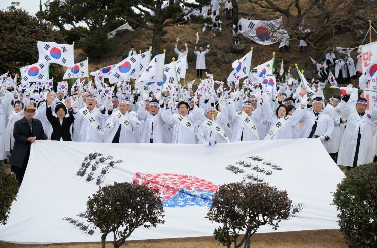 태극기를 높이 든 참석자들이 조천초등학교에서 조천만세동산까지 107년 전 뜨거웠던 항일정신을 기리며 약 1㎞ 구간을 행진한 가운데, 도내 러닝 크루 등 150여 명으로 구성된 ‘3·1 기념 만세 RUN’ 팀이 합류해 함덕해수욕장까지 코스를 함께 달렸다.