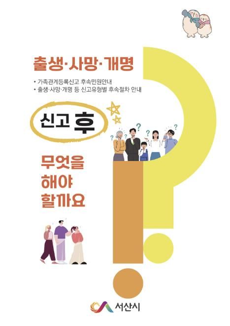 한방통신사 신태공 기자 | 충남 서산시는 가족관계등록신고에 대한 후속민원을 한눈에 알아볼 수 있도록 ‘출생ㆍ사망ㆍ개명 신고 후 무엇을 해야 할까요?’ 책자를 발간했다고 밝혔다.