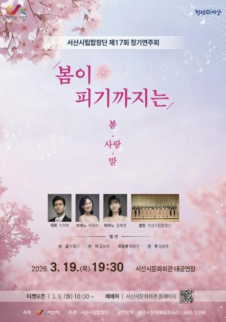 공연 좌석은 전석 무료며, 좌석 예매는 오는 3월 9일 오전 10시부터 서산시 문화회관 누리집을 통해 할 수 있다.