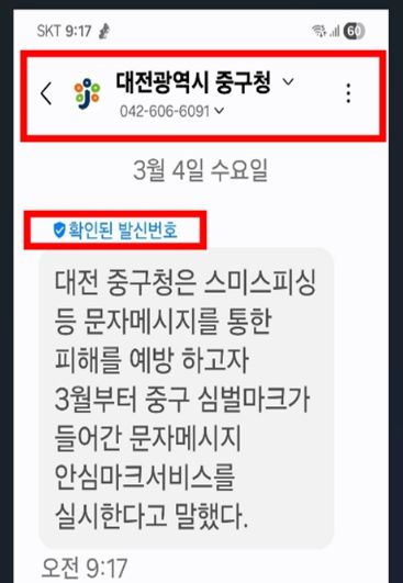 한방통신사 신태공 기자 | 대전 중구는 구청에서 발송하는 구정 안내 및 민원처리 관련 문자메시지의 신뢰도를 높이고 스미싱 피해를 예방하기 위해 ‘안심마크서비스(RCS)’를 본격 시행한다고 5일 밝혔다.