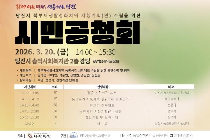 한방통신사 신태공 기자 | 당진시는 오는 20일 오후 2시 송악사회복지관(송악읍 송악로 656)에서 북부농촌재생활성화지역*을 대상으로 수립한‘농촌 공간 재구조화 및 재생 시행계획(안)’에 대한 공청회를 개최한다고 6일 밝혔다.