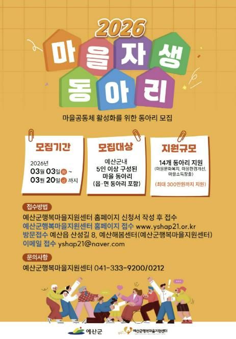 한방통신사 신태공 기자 | 예산군행복마을지원센터는 마을에 활력을 불어넣고 마을공동체 회복을 도모하기 위해 2026년 마을자생동아리를 3월 20일까지 모집한다고 밝혔다.