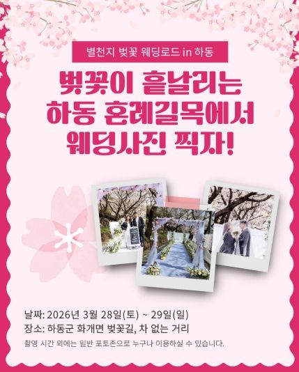 한방통신사 신유철기자 기자 | 하동군은 오는 3월 27일부터 29일까지 열리는 ‘제27회 화개장터 벚꽃축제’를 앞두고, 특별한 웨딩 촬영 이벤트의 참가 신청을 받는다고 밝혔다.