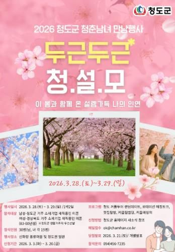 한방통신사 신유철기자 기자 | 경북 청도군은 다가오는 봄을 맞아 바쁜 직장 생활로 인연을 만날 기회가 부족했던 청년들을 위해, 아름다운 청도 관광 명소를 여행하며 자연스럽게 인연을 찾는 미혼남녀 만남행사‘청(도)설(렘)모(임) 프로젝트’를 개최하고 참가자를 모집한다고 밝혔다.