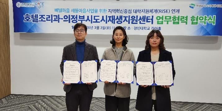 한방통신사 신유철기자 기자 | 의정부시도시재생지원센터는 3월 3일 경민대학교 호텔조리과와 성공적인 빼벌새뜰마을사업을 위해 업무협약을 체결했다.