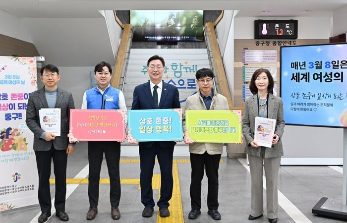 한방통신사 신태공 기자 | 대전 중구는 ‘3.8 세계 여성의 날’을 앞두고 지난 6일 구청 본관 로비에서 노사가 함께 출근하는 직원들을 격려하며 ‘좋은 직장, 서로 존중 캠페인’을 전개했다고 밝혔다.