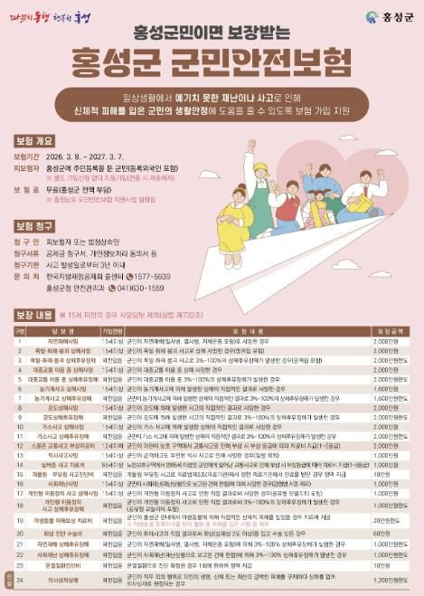 홍성군 군민안전보험은 홍성군에 주소지를 둔 군민이라면 누구나 별도의 가입절차 없이 보험에 가입되는 제도이며, 국내 어디서든 재난이나 사고를 당했을 때 약정된 보험금을 지급받을 수 있다.