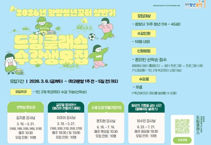 한방통신사 신다은기자 기자 | 광양청년꿈터는 지역 청년이 직접 기획하고 운영하는 청년 주도형 학습 프로그램 ‘2026년 상반기 드림클래스’ 수강생을 모집한다고 밝혔다.