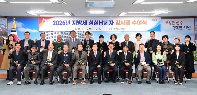 한방통신사 신유철기자 기자 | 진주시는 10일 시청 문화강좌실에서 지방세 납부에 대한 시민의식을 높이고 건전한 납세문화 조성을 위한 ‘2026 지방세 성실납세자 감사패 수여식’을 개최했다.