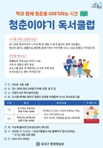 한방통신사 신태공 기자 | 대전 유성구는 4월과 9월 진잠도서관에서 지역 청년을 대상으로 ‘2026년 청춘이야기 독서클럽’을 운영한다.