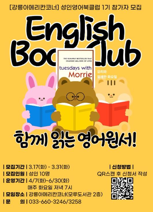한방통신사 양호선기자 기자 | 강릉아메리칸코너(모루도서관 2층)는 시민들의 영어 능력 향상과 깊이 있는 독서 문화 조성을 위해 ‘성인 영어 북클럽 1기’ 참가자를 모집한다.
