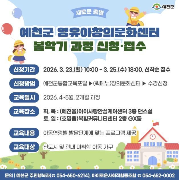 한방통신사 신유철기자 기자 | 예천군은 관내 영유아의 건강한 성장과 창의력 발달을 지원하기 위해 예천군 영유아 창의문화센터 봄학기 프로그램 수강생을 모집한다.