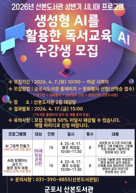 모집 대상은 55세 이상 군포 시민이며 산본도서관 2층 대강당에서 각 프로그램마다 8회차로 진행된다. 신청은 2026년 4월 7일부터 군포시 도서관 누리집을 통해 선착순으로 접수하고 수강생 명단은 4월 17일 도서관 누리집에 공지된다.
