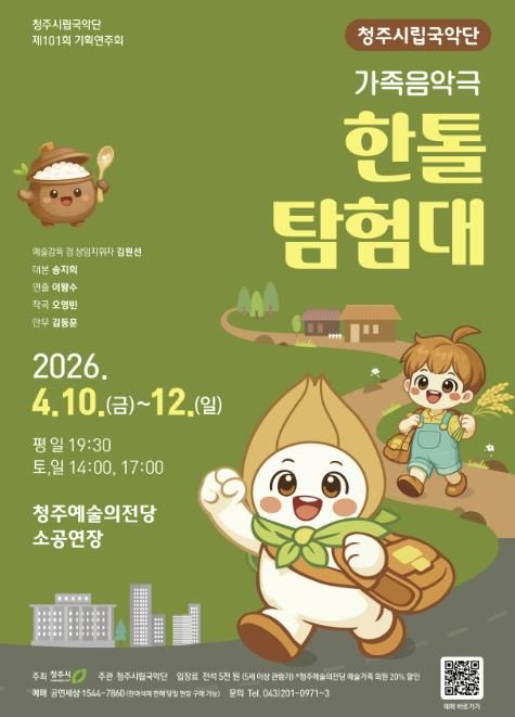 한방통신사 권영분기자 기자 | 청주시립국악단은 4월 10일부터 12일까지 3일간 청주예술의전당 소공연장에서 제101회 기획연주회 가족 음악극 ‘한톨탐험대’를 개최한다고 19일 밝혔다.