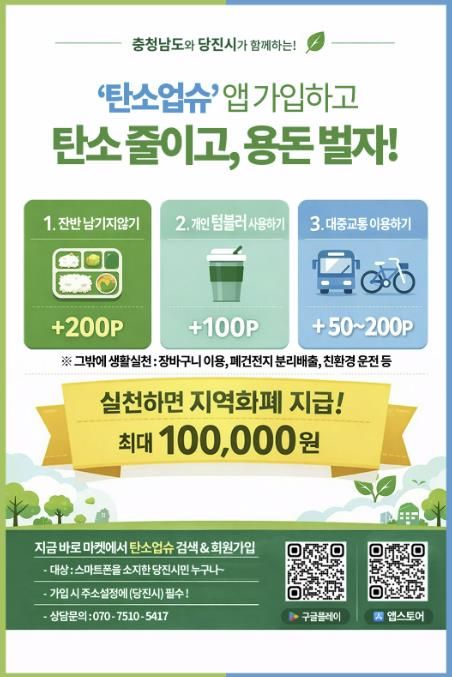 한방통신사 신태공 기자 | 당진시는 기후위기 대응을 강화하고 시민들의 자발적인 탄소중립 실천을 확산하기 위해 충남형 탄소중립포인트제 ‘탄소업슈’ 가입자 확대를 본격 추진한다고 19일 밝혔다.