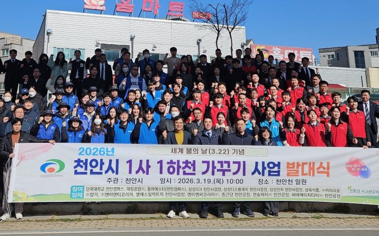 한방통신사 신태공 기자 | 천안시는 세계 물의 날(3월 22일)을 기념해 19일 천안천 일원에서 ‘2026년 1사 1하천 가꾸기 사업’ 발대식을 개최하고 하천 정화활동을 진행했다.
