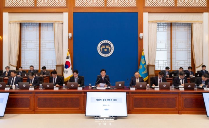 이 대통령은 이날 청와대에서 열린 제28차 수석보좌관회의 모두발언을 통해 "중동 전황의 불투명성이 확대되면서 원유와 일부 핵심 원자재에 대한 보다 적극적이고 장기적인 수급 관리 대책의 필요성이 커지고 있다"며 이 같이 밝혔다.