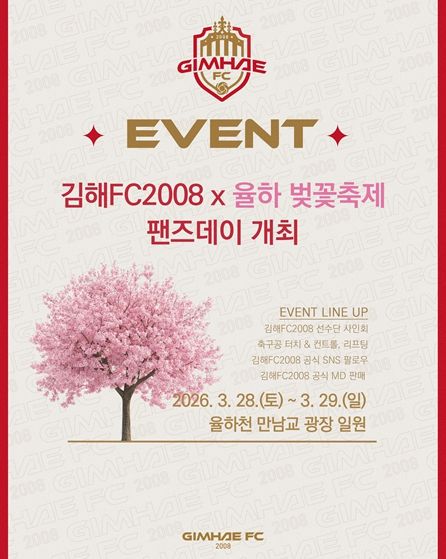 구단 관계자는 “4월에 예정된 원정 경기 일정으로 인해 홈 구장을 잠시 비우게 되는 만큼, 그전에 팬들과 직접 만나 응원의 기운을 나누고자 이번 행사를 기획했다”며 “화창한 봄날, 벚꽃과 함께 김해FC 팬즈데이 부스에서 즐거운 시간을 보내시길 바란다”고 전했다.