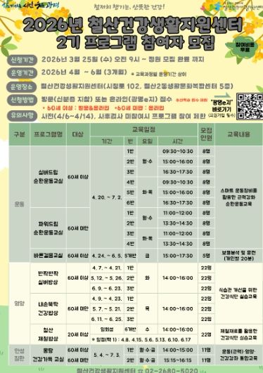 한방통신사 신유철기자 기자 | 광명시 보건소 철산건강생활지원센터가 ‘2026년 건강생활 프로그램 2기’ 참가자를 오는 25일 오전 9시부터 선착순 모집한다.