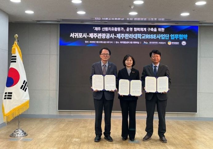 한방통신사 신유철기자 기자 | 서귀포시는 20일 제주관광공사, 제주한라대학교 RISE사업단과 함께 ‘제주 산림치유활동가 운영 협력체계 구축을 위한 업무협약’을 체결했다고 밝혔다.