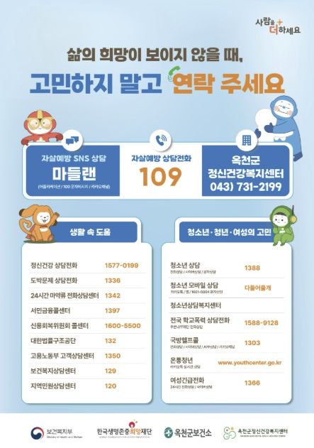 한방통신사 권영분기자 기자 | 옥천군 보건소는 자살률이 증가하는 봄철을 맞아 3월부터 5월까지를 자살 고위험 시기 집중 관리 기간으로 지정하고, 유관기관 등 지역사회 전반과 협력한 생명존중 및 자살예방 활동을 추진한다고 밝혔다.
