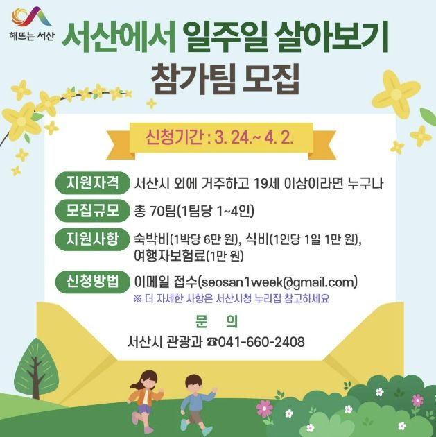 한방통신사 신태공 기자 | 충남 서산시가 3월 24일부터 4월 2일까지 ‘서산에서 일주일 살아보기’ 참가팀을 모집한다고 밝혔다.