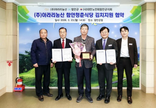 이번 협약은 홀로 식사 해결이 어려운 어르신들을 위한 함안청춘식당에 정기적으로 김치를 후원해 식당을 이용하는 어르신들에게 건강한 먹거리를 안정적으로 제공하고 급식의 질을 높이기 위해 마련됐다. 이에 따라 ㈜아라리농산은 매월 100kg 상당의 고품질 김치를 지원해 함안청춘식당 이용 어르신들에게 제공한다.