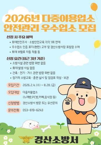 한방통신사 신유철기자 기자 | 경산소방서는 다중이용업소 관계인의 자율안전관리 문화 정착과 안전한 영업 환경 조성을 위해 ‘2026년 다중이용업소 안전관리 우수업소’를 선정한다고 밝혔다.