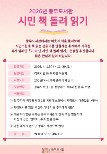 한방통신사 신유철기자 기자 | 김포시 풍무도서관은 오는 4월부터 ‘2026년 시민 책 돌려 읽기’ 독서 릴레이를 운영한다.