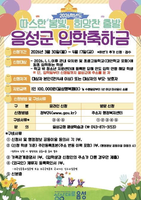 한방통신사 권영분기자 기자 | 음성군은 올해 2026학년도 입학을 맞아 관내 유치원과 초·중·고등학교 입학생, 그리고 학교 밖 청소년지원센터에 등록된 입학 연령에 해당되는 청소년을 대상으로 입학축하금을 지원한다고 밝혔다.