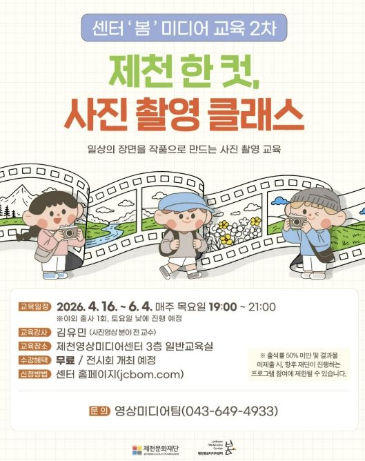수강생들은 구도와 노출, 빛의 활용 등 촬영 기본기를 익히고 이를 바탕으로 지역을 주제로 한 작품을 제작하게 된다. 특히 5월 23일(토)에 진행되는 6회차 수업은 제천의 관광 명소에서 야외 촬영 실습 형태로 운영될 예정이다.
