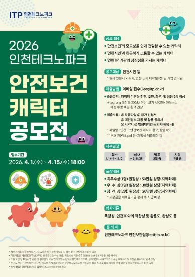 한방통신사 신유철기자 기자 | 인천테크노파크(인천TP)는 오는 4월 1일부터 인천시민과 함께 안전보건 공감대 형성을 위한 ‘2026년 인천테크노파크 안전보건 캐릭터 공모전’을 개최한다.