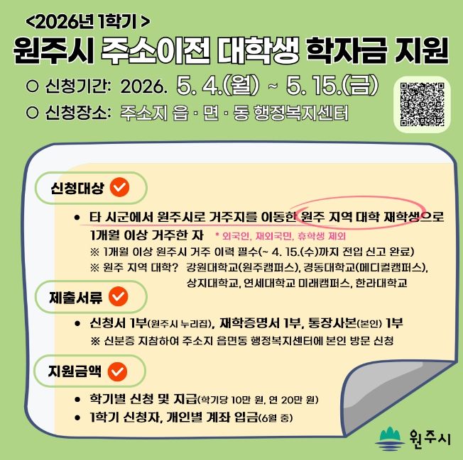 지원 대상은 강원대학교 원주캠퍼스, 경동대학교 메디컬캠퍼스, 상지대학교, 연세대학교 미래캠퍼스, 한라대학교 등 관내 5개 대학 재학생이다. 단, 상·하반기 신청 마감일 기준 한 달 전에 전입신고를 완료해야 하며, 외국인과 재외국민, 휴학생은 신청 대상에서 제외된다.