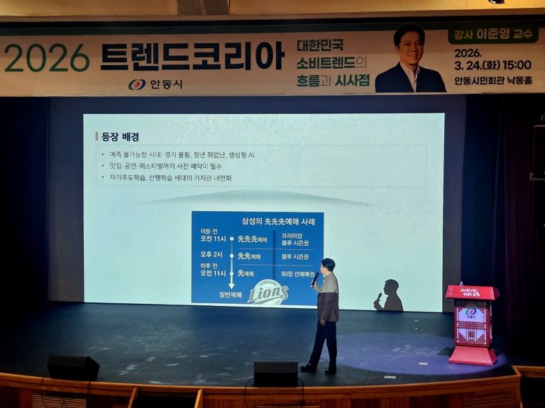 이날 강연은 『트렌드 코리아』 공동저자인 이준영 상명대학교 교수가 ‘2026년 트렌드코리아’를 주제로 진행했으며, 안동시 직원 200여 명이 참석해 높은 관심을 보였다.