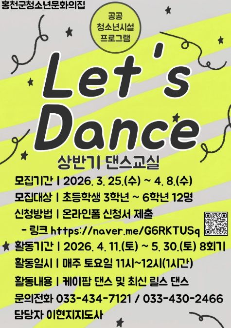 한방통신사 양호선기자 기자 | 홍천군청소년문화의집은 지역 내 초등학생 3학년부터 6학년까지의 청소년을 대상으로 공공 청소년시설 프로그램 “댄스 교실 Let’s Dance” 상반기 참가자를 모집한다.