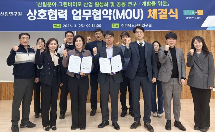 전남도산림연구원은 산림청의 ‘2026년 산림분야 그린바이오 미래형 가치사슬 기술개발(R&D)’ 공모사업에서 4개 과제가 선정돼 총 104억 원의 국비를 확보했으며, 이 중 1개 과제에는 ㈜현대바이오랜드가 공동 연구기관으로 참여하고 있다. 두 기관은 이 과제를 통해 향후 5년간 디지털 기반 원물 양산화와 기능성 검증, 표준화 연구를 함께 수행하며 전남 산림바이오산업의 경쟁력 강화에 힘을 모을 계획이다.