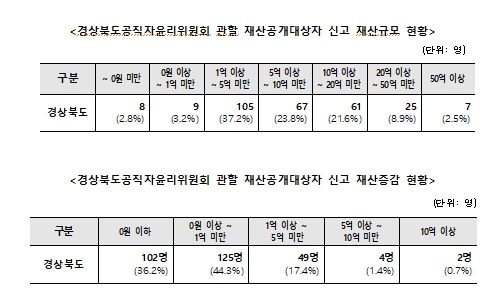 한방통신사 신유철기자 기자 | 경상북도공직자윤리위원회(위원장 이순동)는 소관 재산공개 대상자 282명*의 정기 재산변동사항 신고내역을 경상북도 도보 및 공직자윤리시스템을 통해 이번 달 26일자로 공개했다.