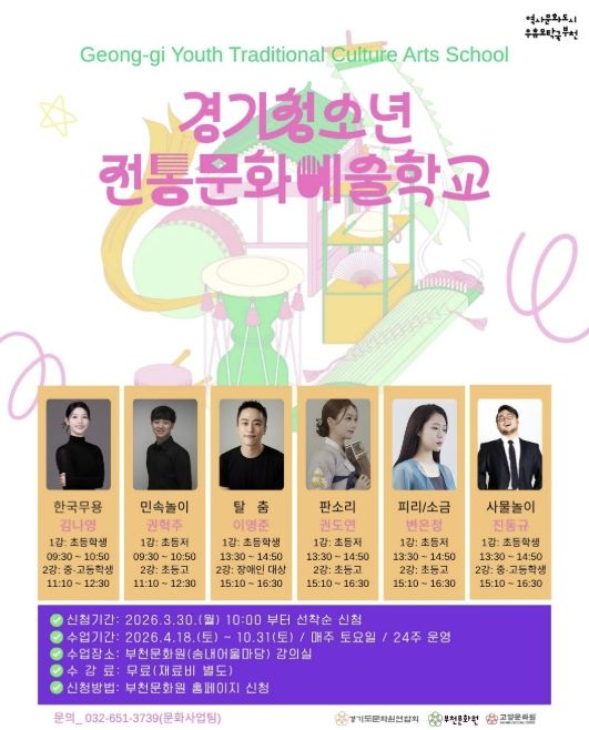 한방통신사 신유철기자 기자 | 부천문화원은 청소년들의 전통문화 참여 기회를 확대하고 경기지역 전통민속예술의 지속 가능한 전승 기반 마련을 위한 ‘2026 경기청소년전통문화예술학교’ 참여 학생을 모집한다.
