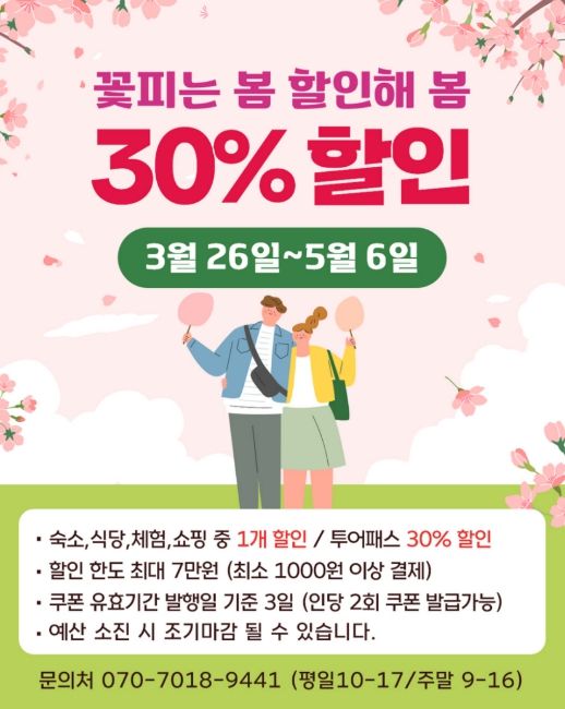 이번 꽃피는 봄 할인해 봄 프로모션은 3월 26일부터 5월 6일까지 진행되며, 안동 벚꽃축제(4.1.~4.5.)와 선성현 어린이날 행사(5.1.~5.5.), 차전장군 노국공주축제(5.1.~5.5.) 등 주요 봄 축제 기간과 맞물려 경북 북부 지역에 관광 활력을 불어넣기 위해 마련됐다.