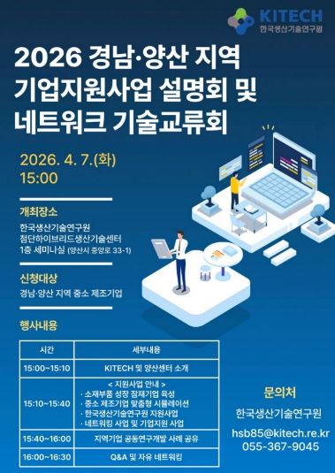한방통신사 신유철기자 기자 | 양산시는 오는 7일 한국생산기술연구원 첨단하이브리드생산기술센터 세미나실에서 지역 산업 발전 촉진과 관내 제조기업의 기술 혁신을 도모하기 위해 ‘2026년 기업지원사업 설명회 및 네트워크 기술교류회’를 개최한다고 밝혔다.