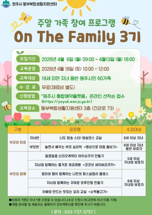 한방통신사 양호선기자 기자 | 원주시 동부복합생활지원센터는 오는 18일, 주말 가족 참여 프로그램 ‘온 더 패밀리(On The Family)’ 3기 과정을 운영한다.