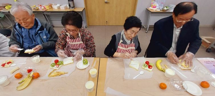 요리교실에서는 뇌 건강에 도움이 되는 견과류를 활용한 ‘견과류 계란빵’과 면역력 강화에 좋은 신선한 과일을 활용한 ‘과일 샌드위치’를 함께 만들었다. 어르신들은 재료를 직접 손질하고 조리하는 과정을 통해 소근육을 자극하고 집중력을 높였으며, 가족들과 협력하며 자연스럽게 대화를 나누는 시간을 가졌다. 특히 간단하면서도 영양이 풍부한 메뉴로 가정에서도 쉽게 따라 할 수 있어 참여자들의 큰 호응을 얻었다.
