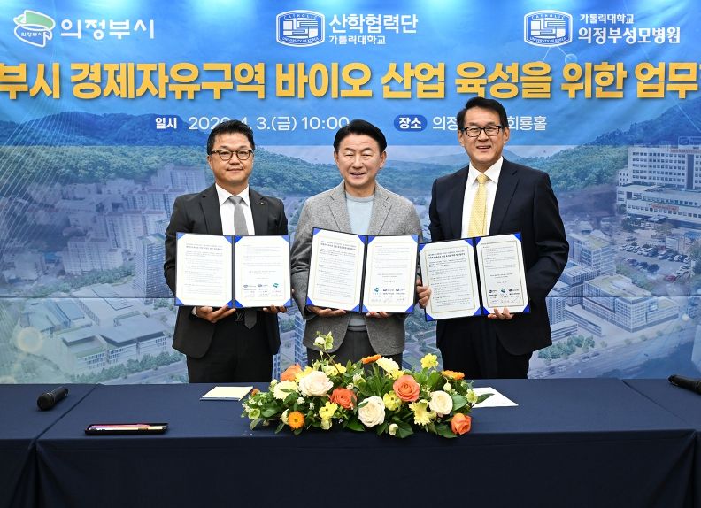 한방통신사 신유철기자 기자 | 의정부시는 4월 3일 시청 회룡홀에서 가톨릭대학교 의정부성모병원, 가톨릭대학교 산학협력단과 함께 ‘의정부시 경제자유구역 바이오 산업 육성을 위한 업무협약’을 체결했다.