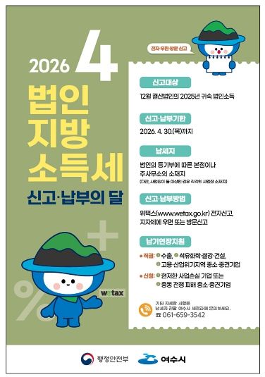 한방통신사 신다은기자 기자 | 여수시는 4월 한 달간 ‘2025년 귀속 법인지방소득세에 대한 집중 신고·납부 기간’을 운영한다고 밝혔다.