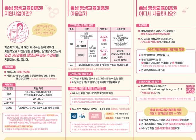 한편, 신청 및 카드발급 등 관련 문의는 충남 평생교육이용권 상담콜센터 또는 누리집 게시판을 통해 확인할 수 있다.